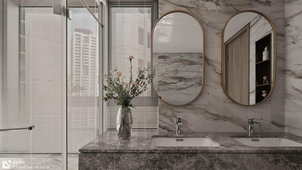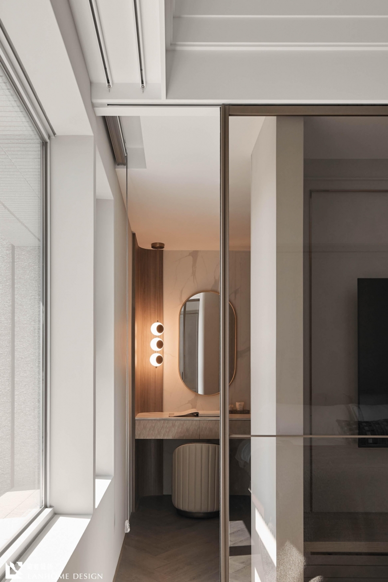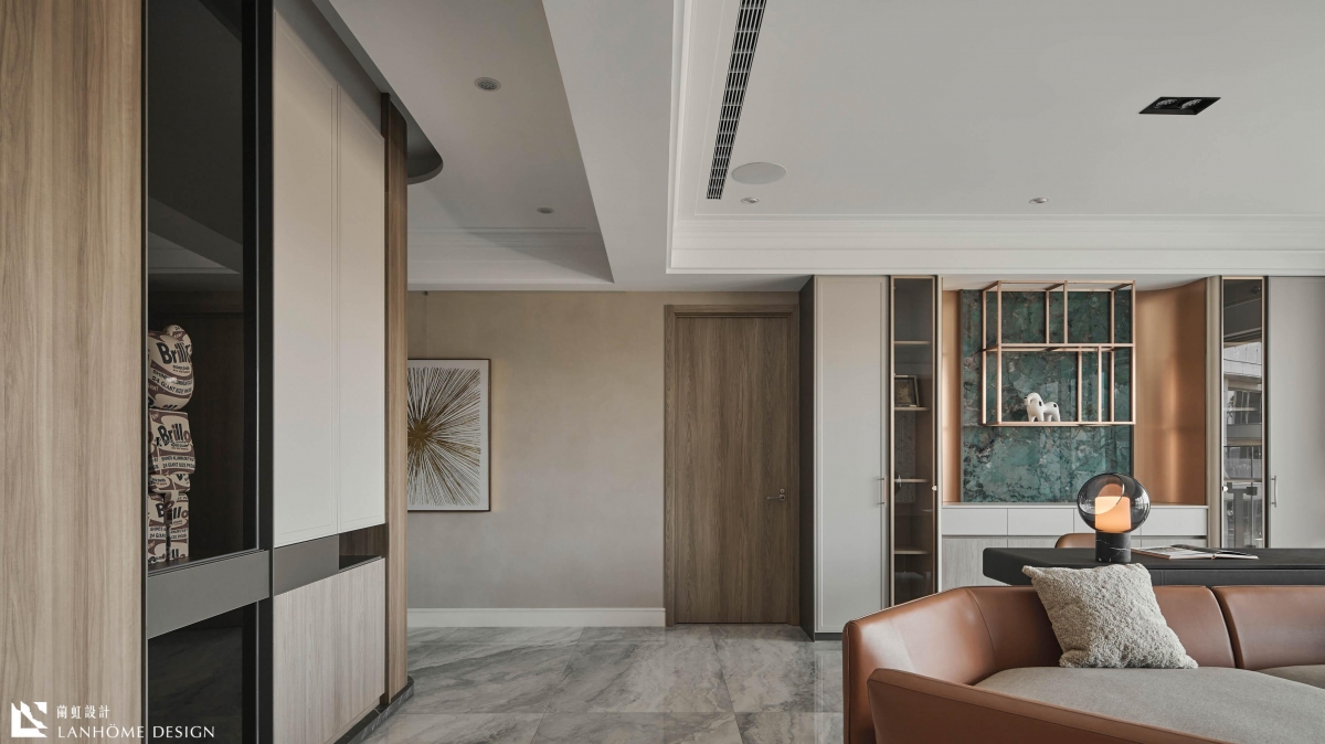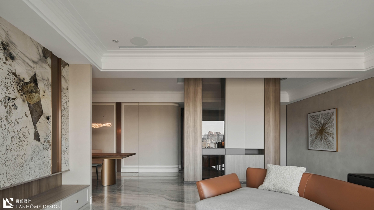 全案以現代美式風格為基調,融入輕奢氣息,以暖色與木紋材質鋪陳溫潤基底,透過弧形曲線和線板細節描摹柔和的空間語彙。玄關位於格局的核心位置,設計柱體屏風,兼具端景與視覺過渡,帶來歸家的儀式感與溫馨氛圍。